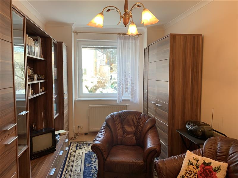- dwóch sypialni z ekspozycją okien na północny zachód. Powierzchnie pokoi: 11, 2 m2 oraz 22 m2 (możliwość podziału na dwa mniejsze pokoje, w pomieszczeniu znajdują się dwa okna, w tym jedno balkonowe), Większa sypialnia mieści dużą szafę typu komandor z rozsuwanymi drzwiami z lustrem.