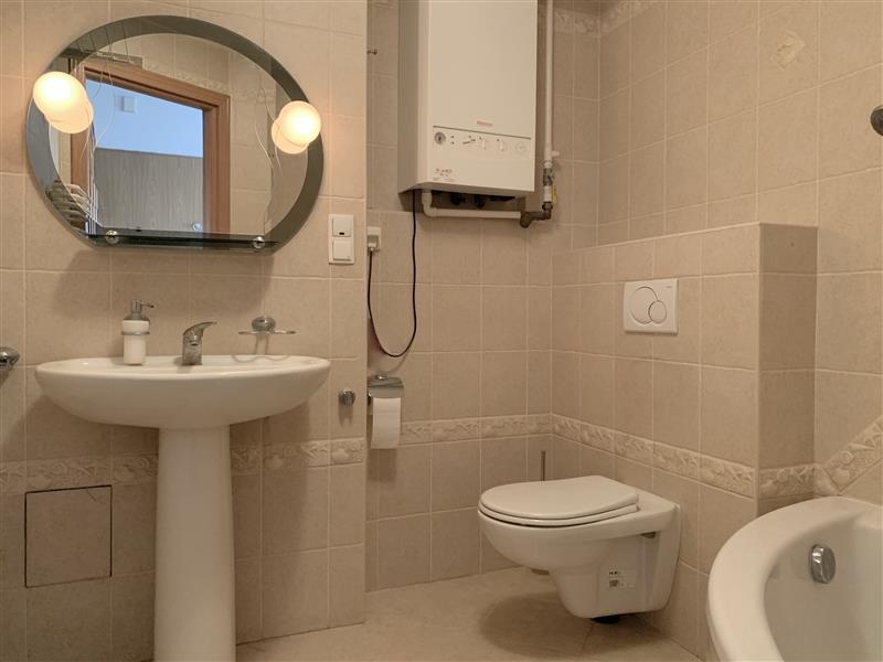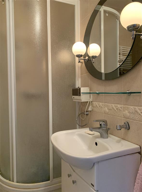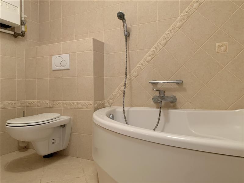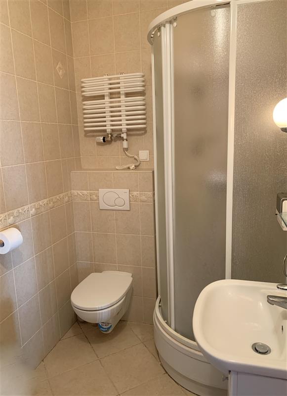 - dwie łazienki wykończone w pastelowych kafelkach, jedna wyposażona w wannę narożną, druga w kabinę prysznicową.