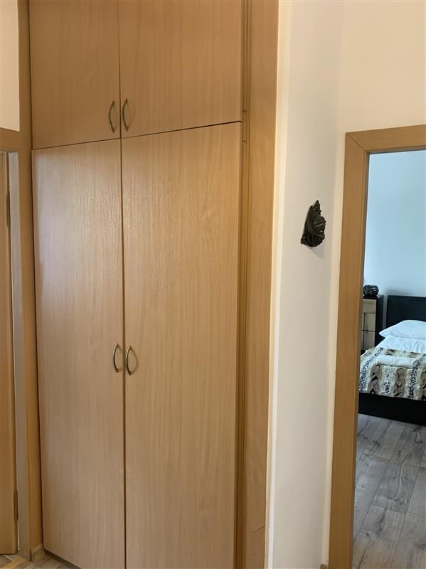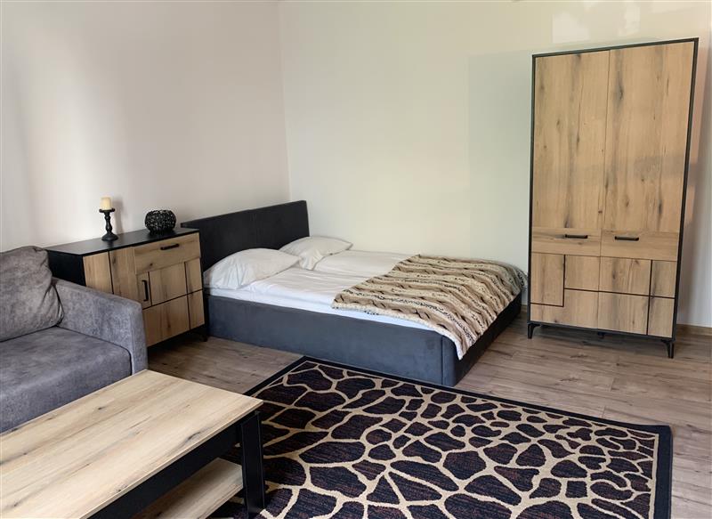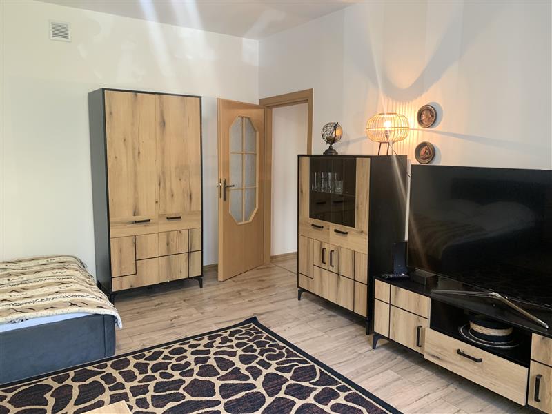 W pokoju mieści się narożna sofa z funkcja spania, duże łóżko, komplet mebli: komodym szafa, witryna, stolik kawowy, telewizor., Kuchnia jest wyposażona w zabudowę meblową oraz sprzęt AGD: zmywarkę, piekarnik, płytę, lodówkę, okap oraz kuchenkę mikrofalową i pralkę.