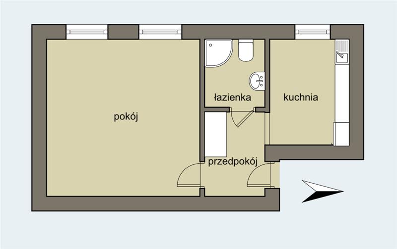 Mieszkanie składa się z pokoju, osobnej kuchni, przedpokoju i łazienki.