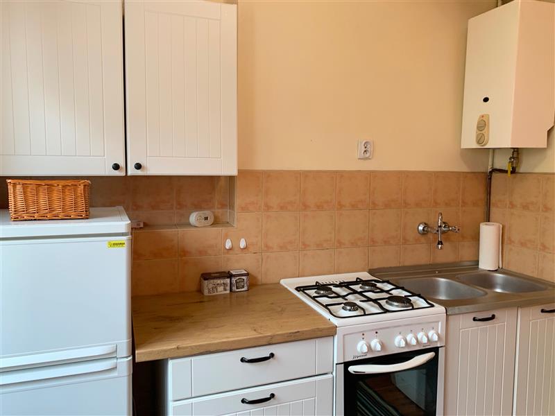 oddzielnej, jasnej kuchni, w której mieści się nowa kuchenka i pralka,