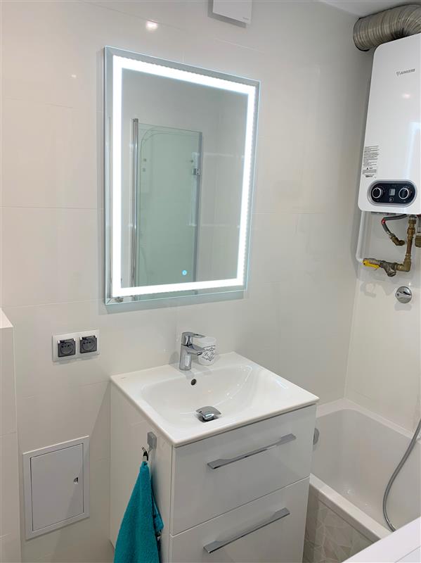 Łazienka jest wykończona w białych kafelkach, wyposażona w wannę ze szklanym panelem prysznicowym oraz pralkę. W łazience mieści się toaleta, szafka z umywalką oraz podświetlane lustro. Ciepła woda jest ogrzewana za pomocą nowego pieca gazowego.