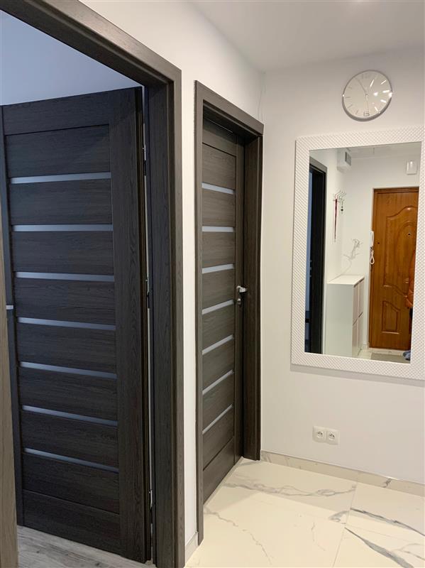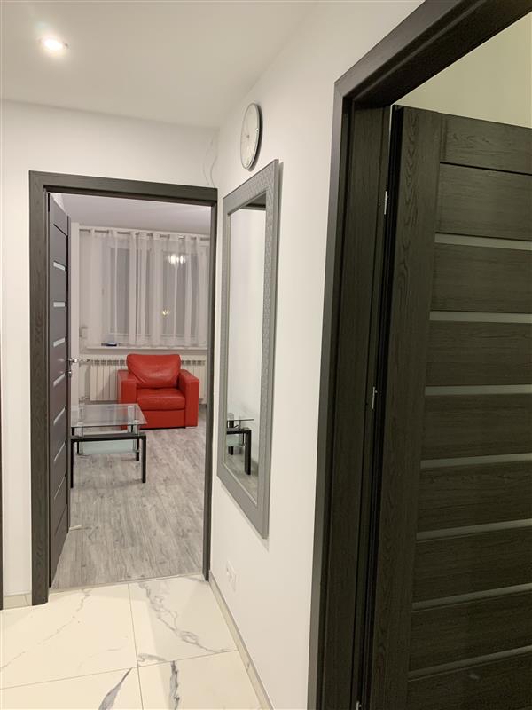 W przedpokoju znajduje się szafka na buty oraz wieszaki. Wnętrze wykończone z wysokiej jakości materiałów. Mieszkanie jest świeżo odmalowane, wyposażone w nowe drzwi wewnętrzne oraz nowe drzwi wejściowe - antywłamaniowe, ściany we wszystkich pomieszczeniach są białe, wszystkie urządzenia i sprzęty są nowe - na gwarancji. Na podłodze w pokojach mieszczą się panele, w przedpokoju, kuchni oraz łazience płyty gresowe. Całość dopełniają gustowne lampy. Okna w całym mieszkaniu są nowe - PCV, wyposażone w rolety wewnętrzne typu plisa, firanki oraz zewnętrzne kraty wykonane z metaloplastyki.