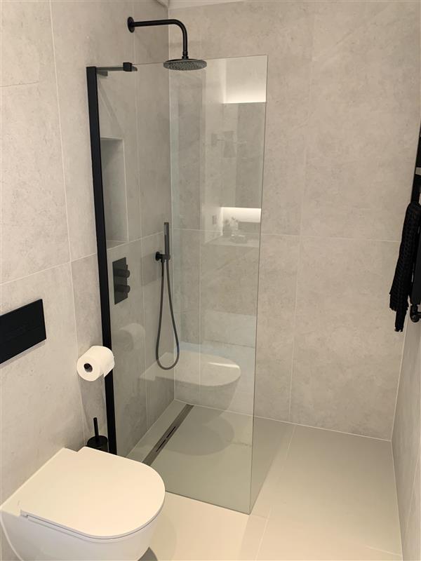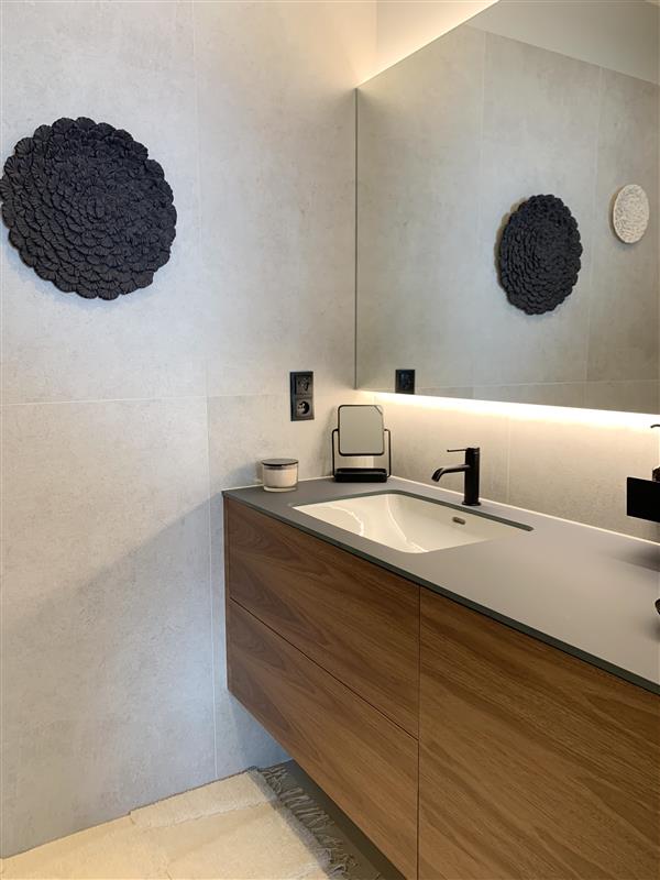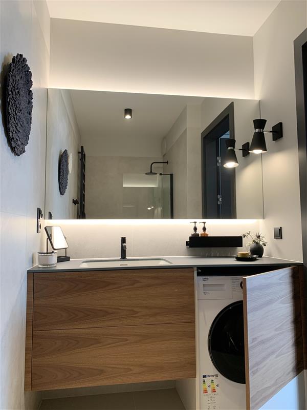 - łazienki o pow.: 5,3 m2 z kabiną prysznicową, wyposażonej w szafkę z umywalką oraz pralko-suszarkę, duże lustro, wc,
