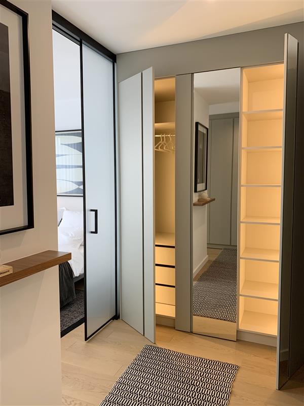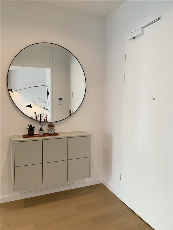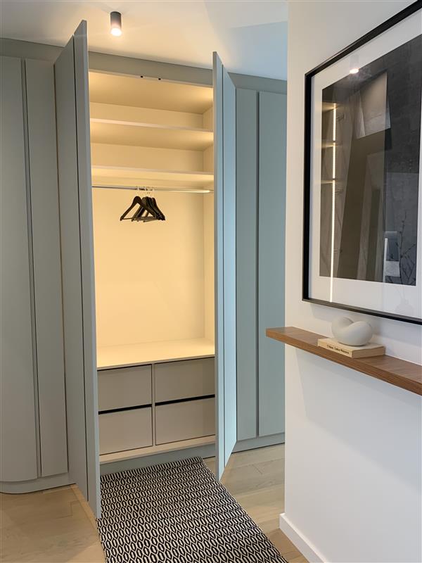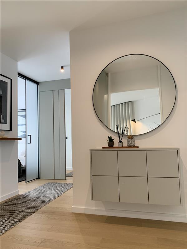 - holu o pow.: 12,37 m2 w którym mieszczą się dwie pojemne szafy wyposażone w relingi, półki i szuflady i oświetlenie, dodatkowo w holu znajduje się duże wiszące lustro oraz szafka z szufladami i oświetlenie punktowe.