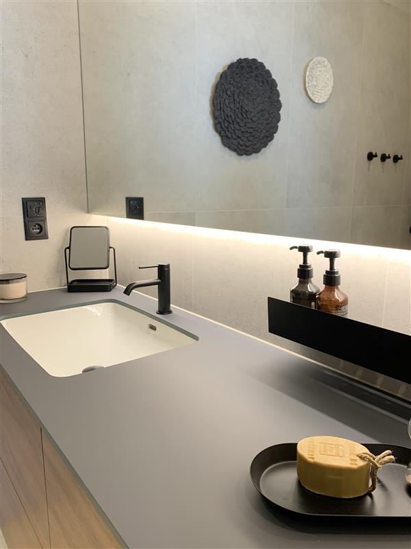 - salonu z aneksem kuchennym ze strefą jadalną o pow.: 32,24 m2, wyposażony w sofę, fotel, stoliki kawowe, szafkę RTV wraz z telewizorem, stół z krzesłami, oświetlenie, podświetlane półki, regał z książkami. Z salonu jest wyjście na taras o pow.: 6,1 m2, gdzie mieszczą się dwa fotele, stolik, z ładnym widokiem na panoramę miasta. Aneks kuchenny jest wyposażony w zabudowę meblową na wymiar, ze sprzętem AGD: (zmywarka, płyta indukcyjna, okap, lodówka z zamrażalnikiem, piekarnik). Całość dopełniają gustowne dodatki i oświetlenie.
