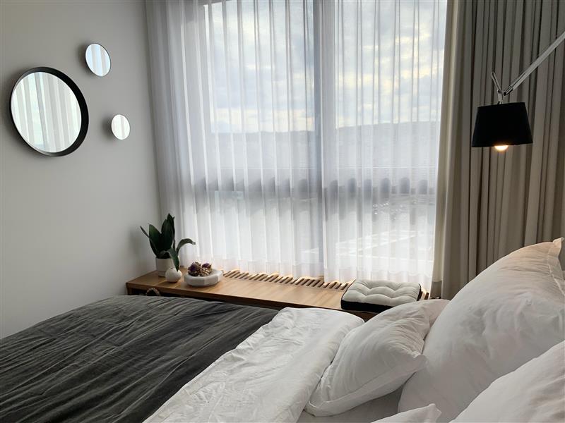 - sypialni o pow.: 9,32 m2, mieszczącej łóżko z tapicerowanym zagłówkiem, stolik nocny, oświetlenie, dekoracje, sypialnia jest zamykana przesuwnymi szklanymi drzwiami w metalowej ramie.