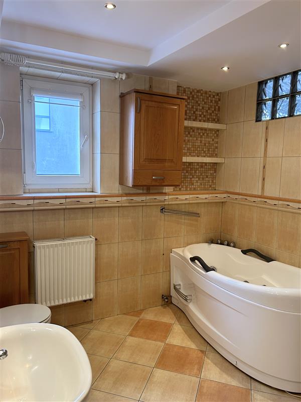 łazienki z oknem, wyposażonej zarówno w wannę z hydromasażem, jak i kabinę prysznicową, toaletę i bidet,